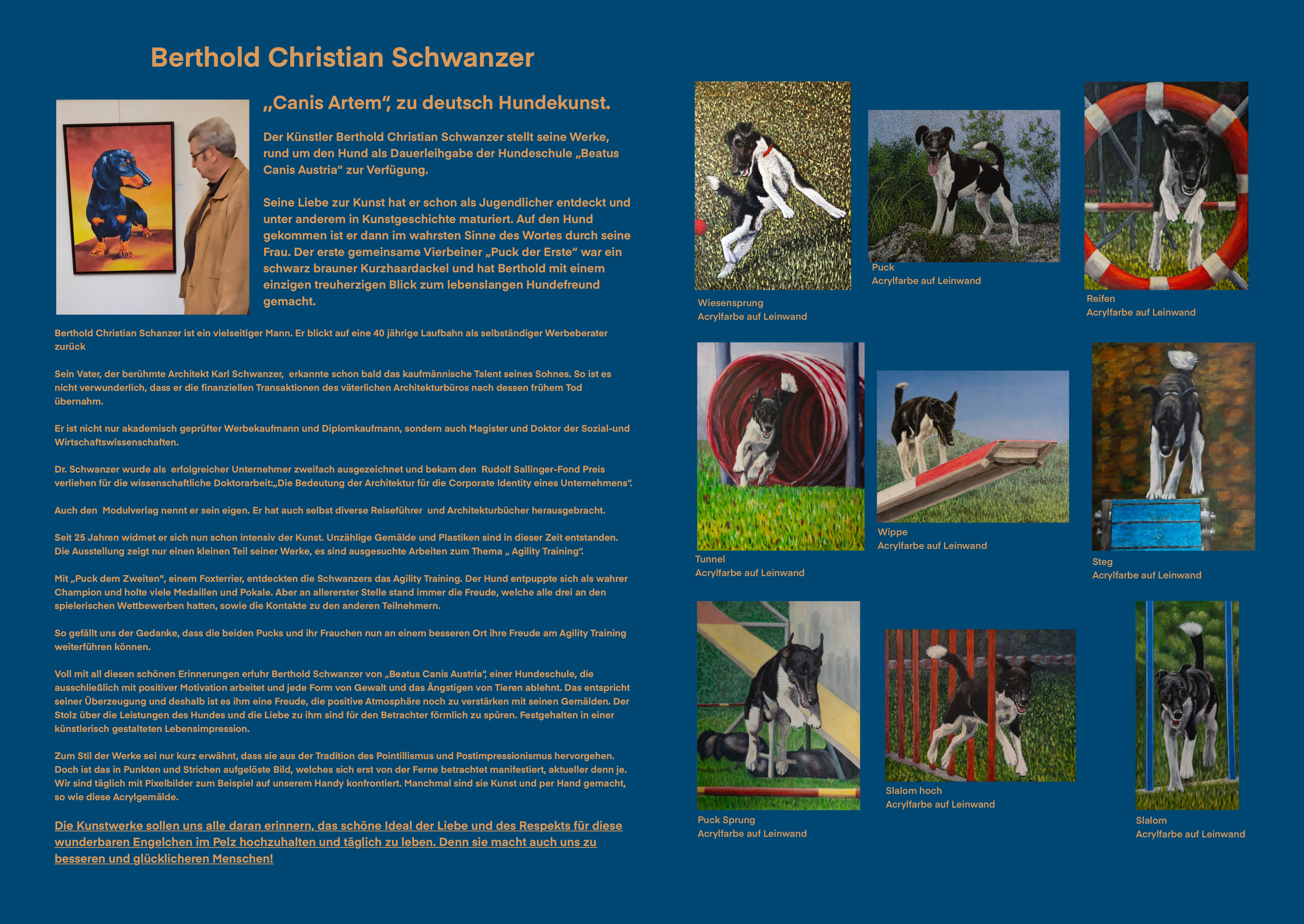 Im Februar 2023 stellt Dr. Berthold Christian Schwanzer seine Hundegemälde der Hundeschule „Beatus Canis Austria“ als Dauerleihgabe zur Verfügung. Beim Event „Canis Artem“ Zeigen auch die Hunde ihre Kunststücke welche sie erlernt haben.